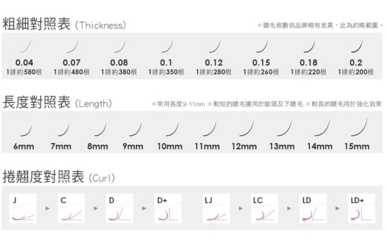 仿生睫毛的長度,捲曲度,密度和長度都是以毫米計算的,從8mm到14mm都有,捲曲度分為J Curl, B Curl和D Curl,或者是比較誇張的C Curl和D Curl的款式,後者一般是外國的小姊姊才會接種。而密度也有分成3D、6D、9D,3D,下圖便是睫毛長捲密度的對照大全。而最常見的睫毛款式便是山茶花睫毛和棉花糖睫毛,一般的女生都會選擇這個款式的。